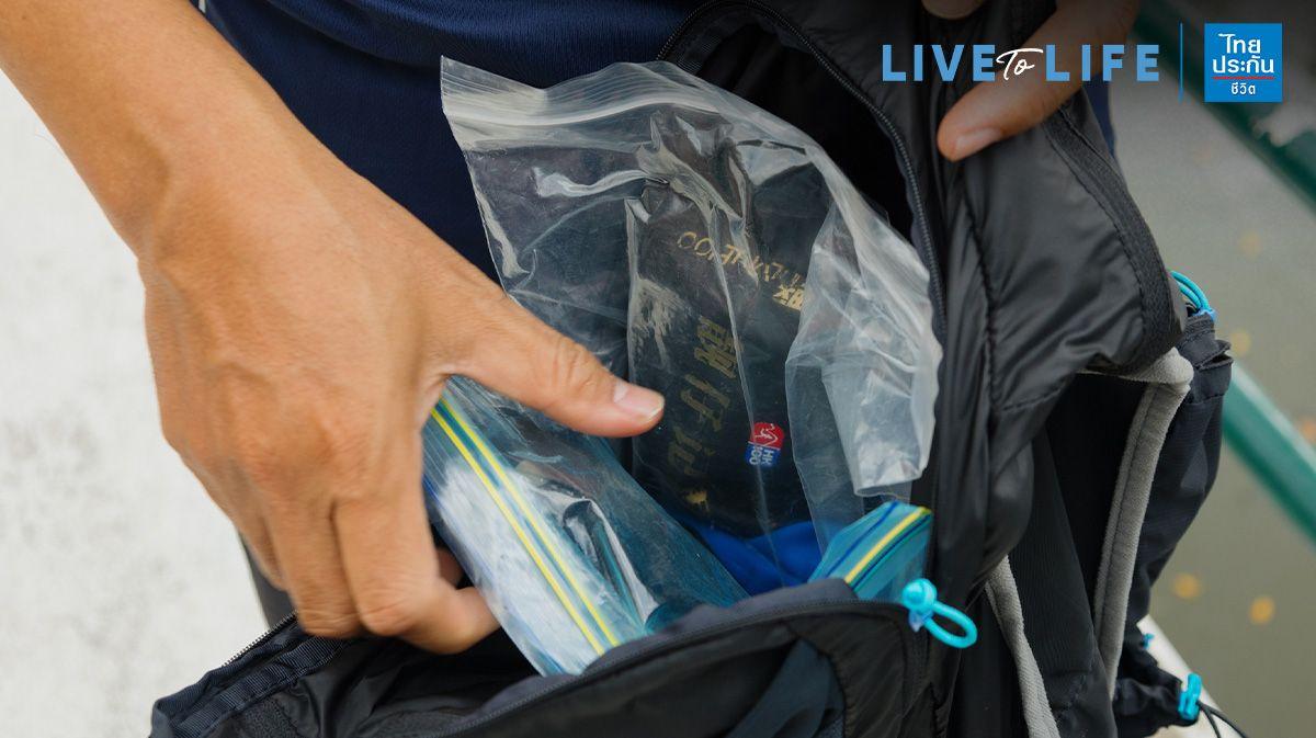 - ถุงซิปล็อก : สำหรับใส่เงิน บัตรประชาชน ใบขับขี่ หรือบัตรเอทีเอ็ม พกเผื่อไว้ในกรณีฉุกเฉิน