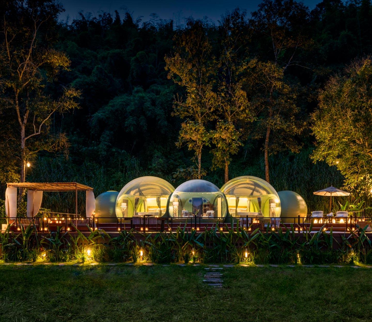 ที่สุดของไลฟ์สไตล์แคมปิ้งไอเดียแปลกใหม่ต้องยกให้ Jungle Bubble โดมใสกลางป่าบริเวณสามเหลี่ยมทองคำ พื้นที่ของอนันตรา สามเหลี่ยมทองคำ จังหวัดเชียงราย โดยโดมใสลักษณะทรงกลมนี้มีเพียง 2 หลัง ยกความหรูหราสะดวกสบายและบริการของโรงแรม 5 ดาวมาไว้ในโดมทั้งหมด ในช่วงกลางวันผู้เข้าพักสามารถใช้บริการห้องอาหาร สระว่ายน้ำ และ Facilities ต่าง ๆ ของโรงแรมได้ทั้งหมด รวมทั้งโปรแกรมเรียนรู้เรื่องช้าง ส่วนกลางคืนก็เข้าสู่บรรยากาศแคมปิ้งในโดมสุดไพรเวท สามารถนอนดูดาวได้แบบ 360 องศา และตื่นมารับอรุณด้วยความน่ารักของช้างจากมูลนิธิโกลเด้น ไทรแองเกิ้ล เอเชียน เอเลเฟนท์ ที่อาศัยอยู่ในพื้นที่ 400 ไร่ของผืนป่าแห่งนี้